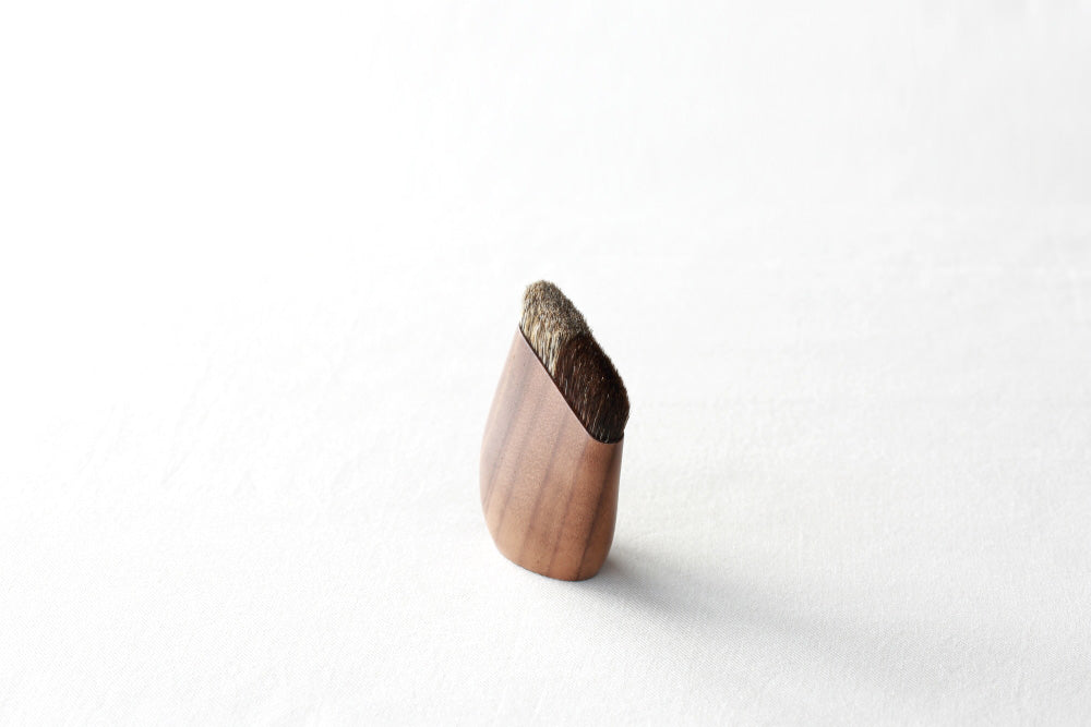 選すぐる「選毛」、熟練の手技で仕上げる「整毛」、「こま」と呼ばれるオリジナル木筒で多彩な穂先を形づくる「山出し」、毛の1本1本にまで魂を注ぎ、目利きならではの勘と経験を生かして生み出されるSHAQUDAのブラッシュからは、職人の見事な心技体と、手仕事ならではのやさしい温もりが伝わってきます。