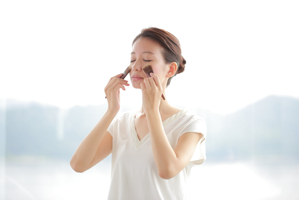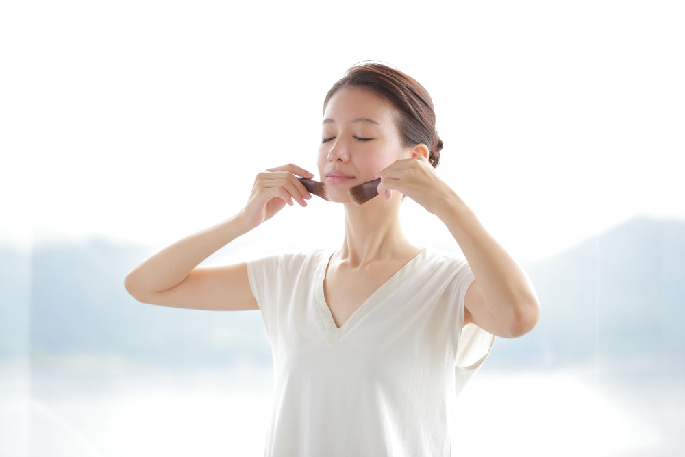 額の生え際から少しずつ筆を下へずらしながら、あごのラインまで行います。〔3セット〕