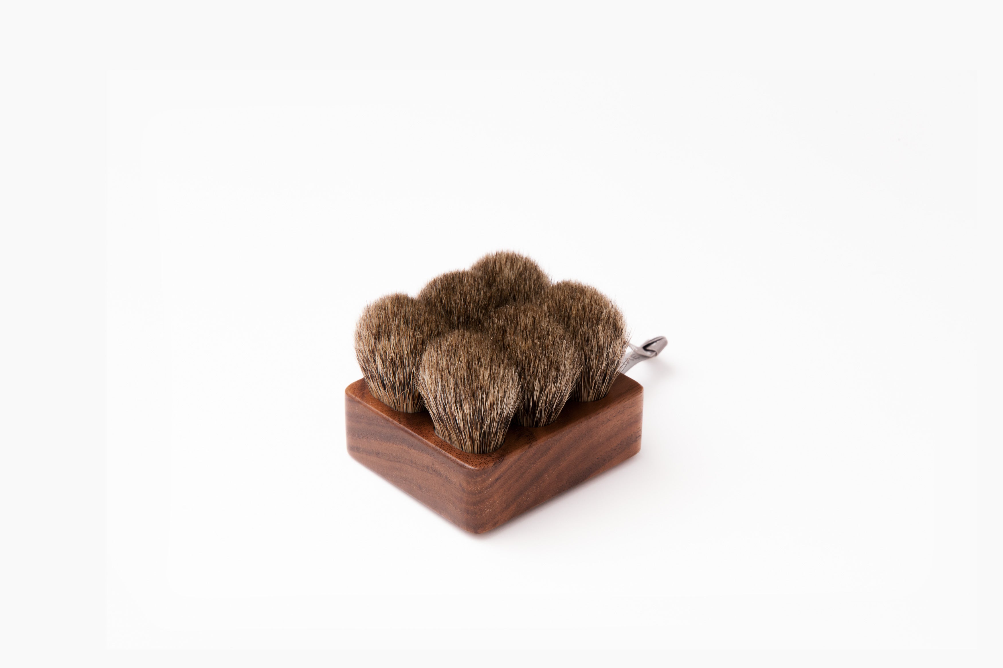 選すぐる「選毛」、熟練の手技で仕上げる「整毛」、「こま」と呼ばれるオリジナル木筒で多彩な穂先を形づくる「山出し」、毛の1本1本にまで魂を注ぎ、目利きならではの勘と経験を生かして生み出されるSHAQUDAのブラッシュからは、職人の見事な心技体と、手仕事ならではのやさしい温もりが伝わってきます。