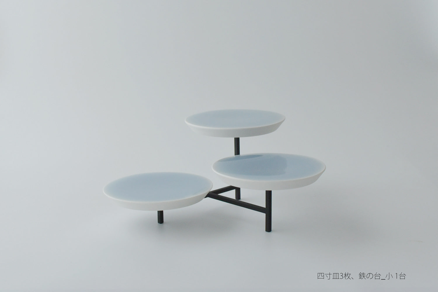 ミシナテーブルウエアに合わせて白から青へうつろう景色を製作いただきました。鉄の台と共にお楽しみください。