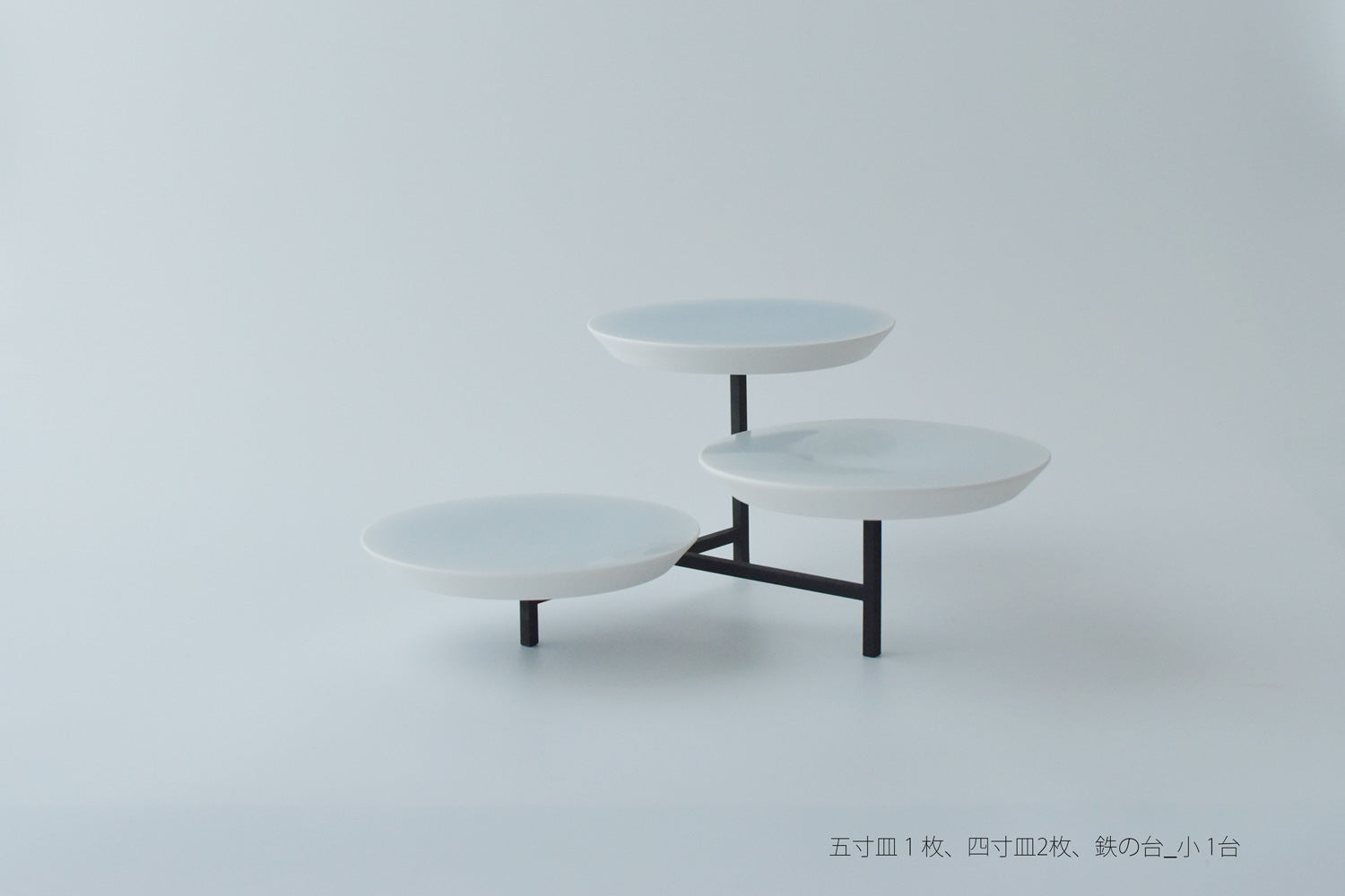 ミシナテーブルウエアに合わせて白から青へうつろう景色を製作いただきました。鉄の台と共にお楽しみください。