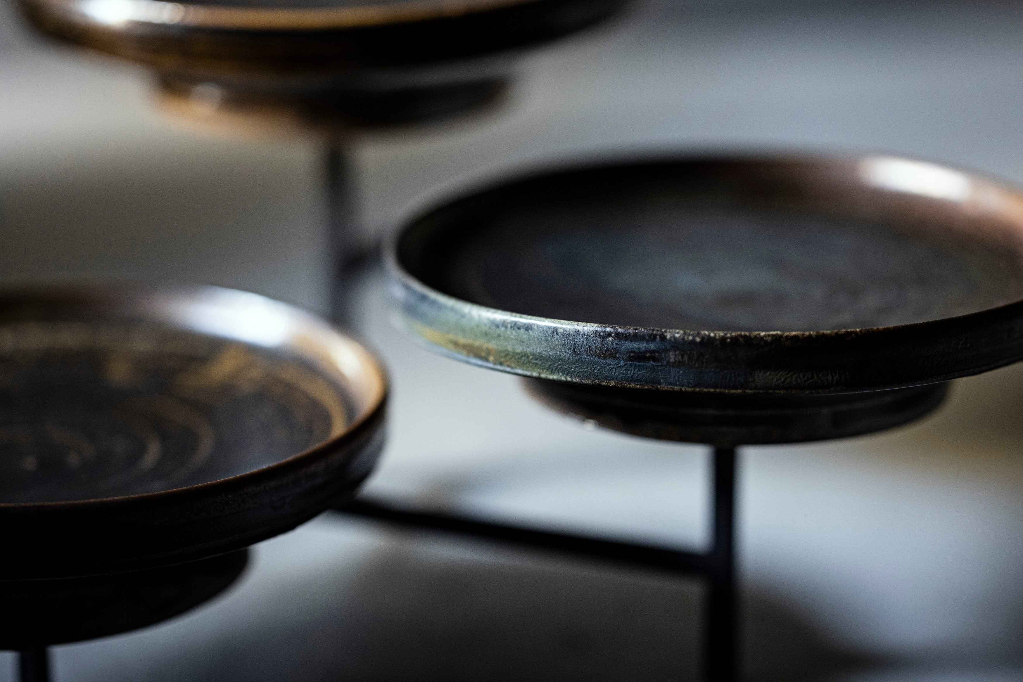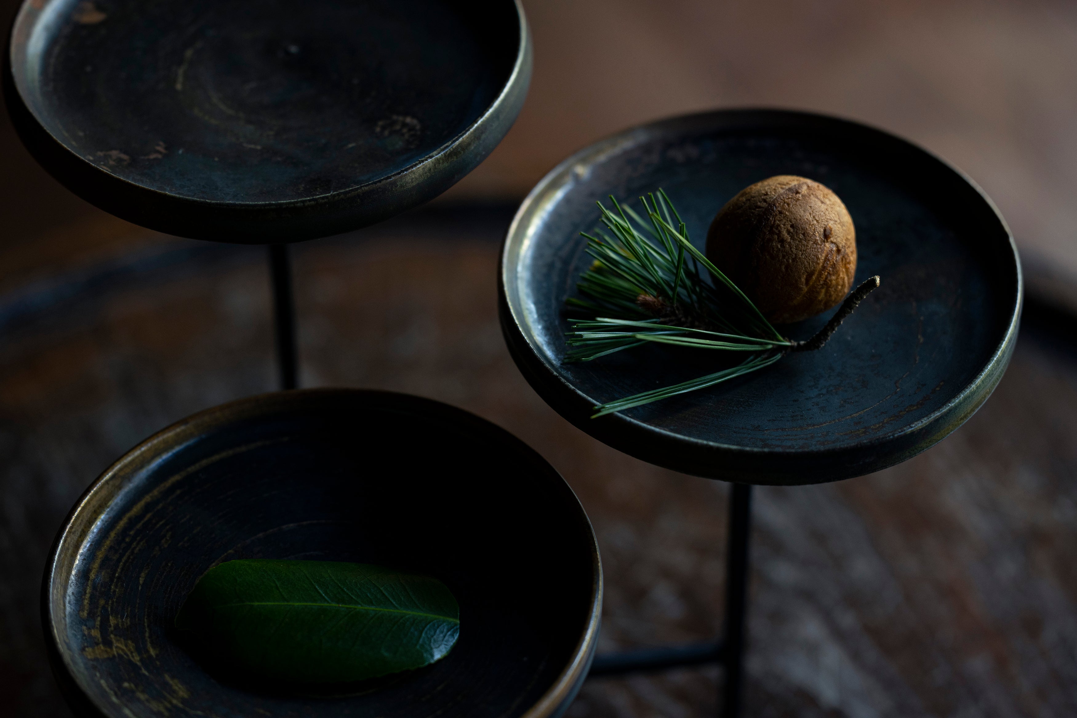 鉄の台 小と3枚の四寸皿を組み合わせたアペタイザースタンドです。菓子や前菜など、ひとくちサイズのお料理を盛ると余白が活き、美しい景色が広がります。平安時代から続く饗宴の作法のひとつ「式三献」に由来する前菜三種盛りや、アフタヌーンティなどで活躍します。