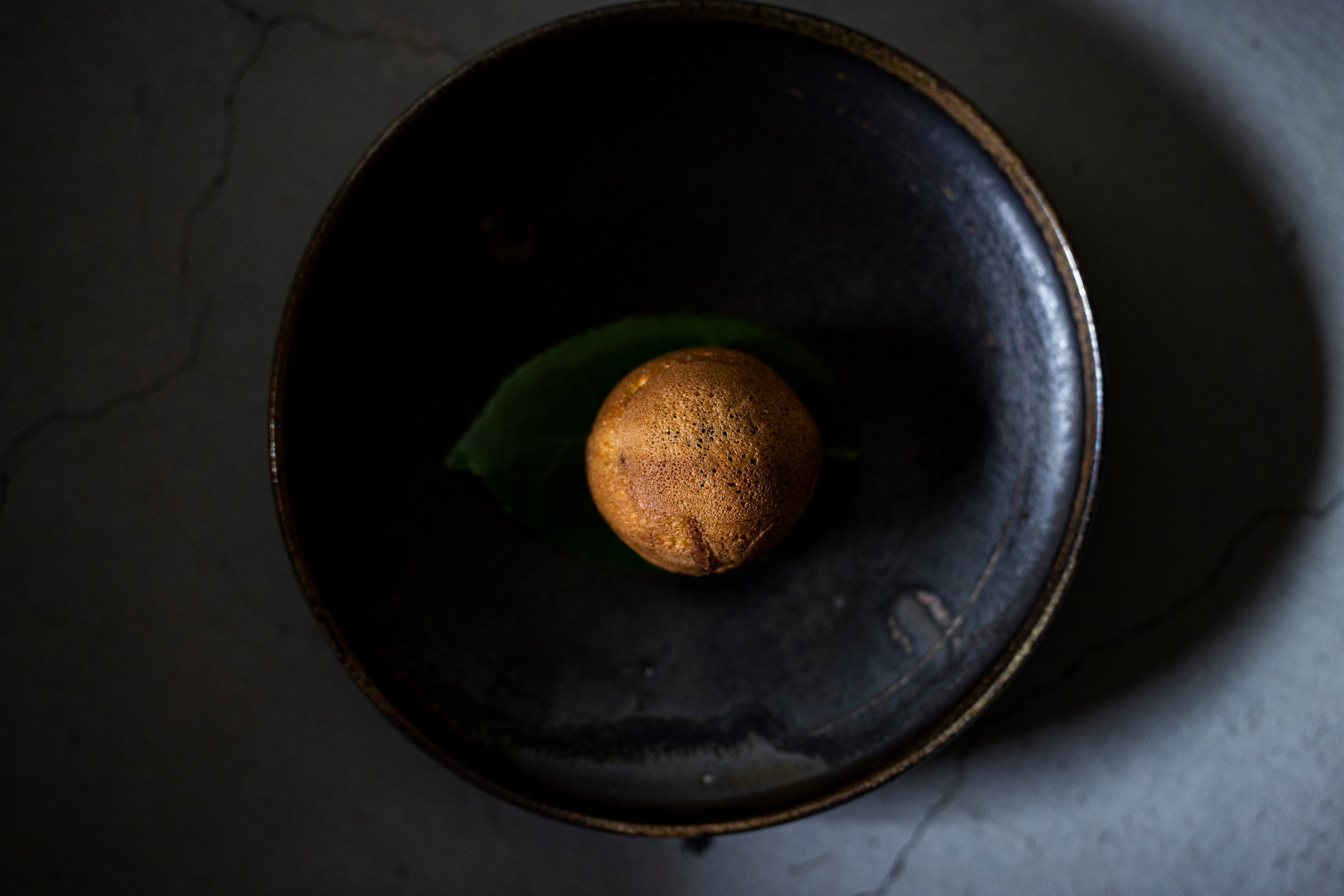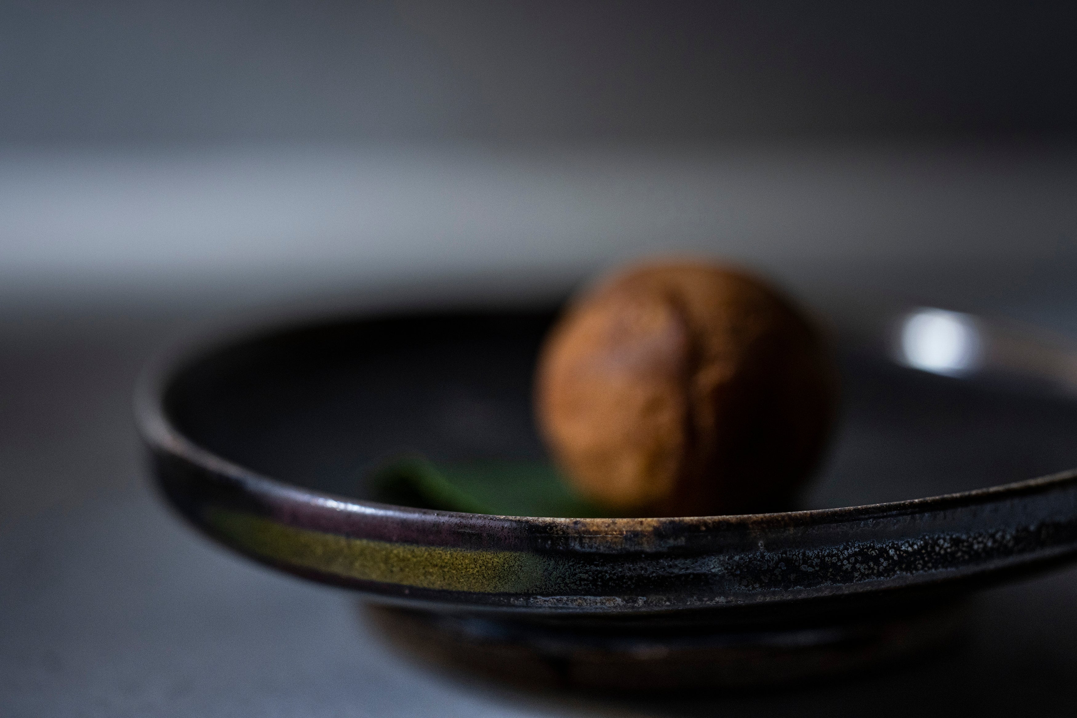 手のひらに収まるほどのサイズながら、ずっしりとした感触と色のインパクト。自由で優美な力強さを持ち、さまざまな表情を醸し出す黒唐津の風合いを楽しむ四寸皿です。菓子や前菜など、ひとくちサイズのお料理を盛ると余白が活き、美しい景色が広がります。