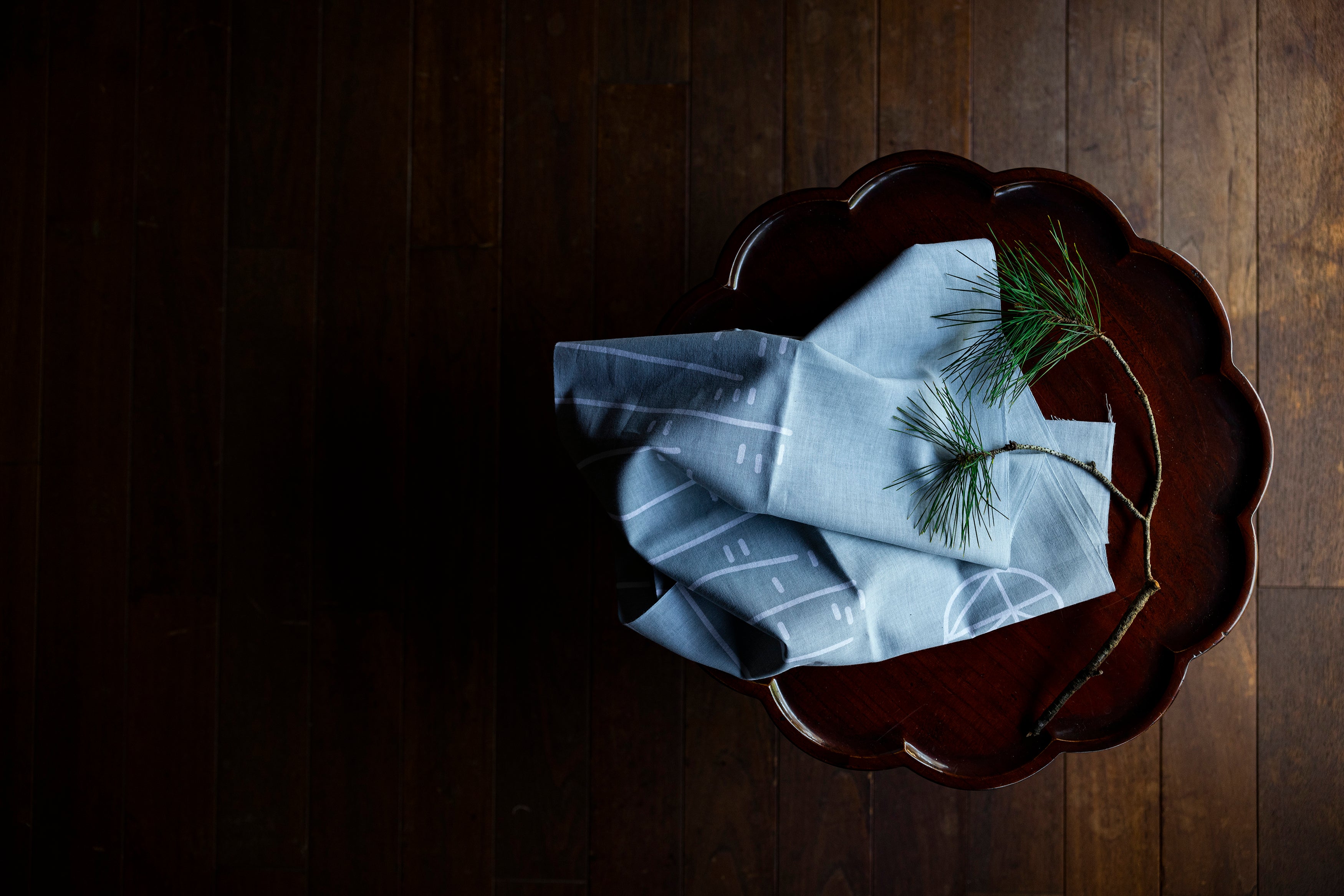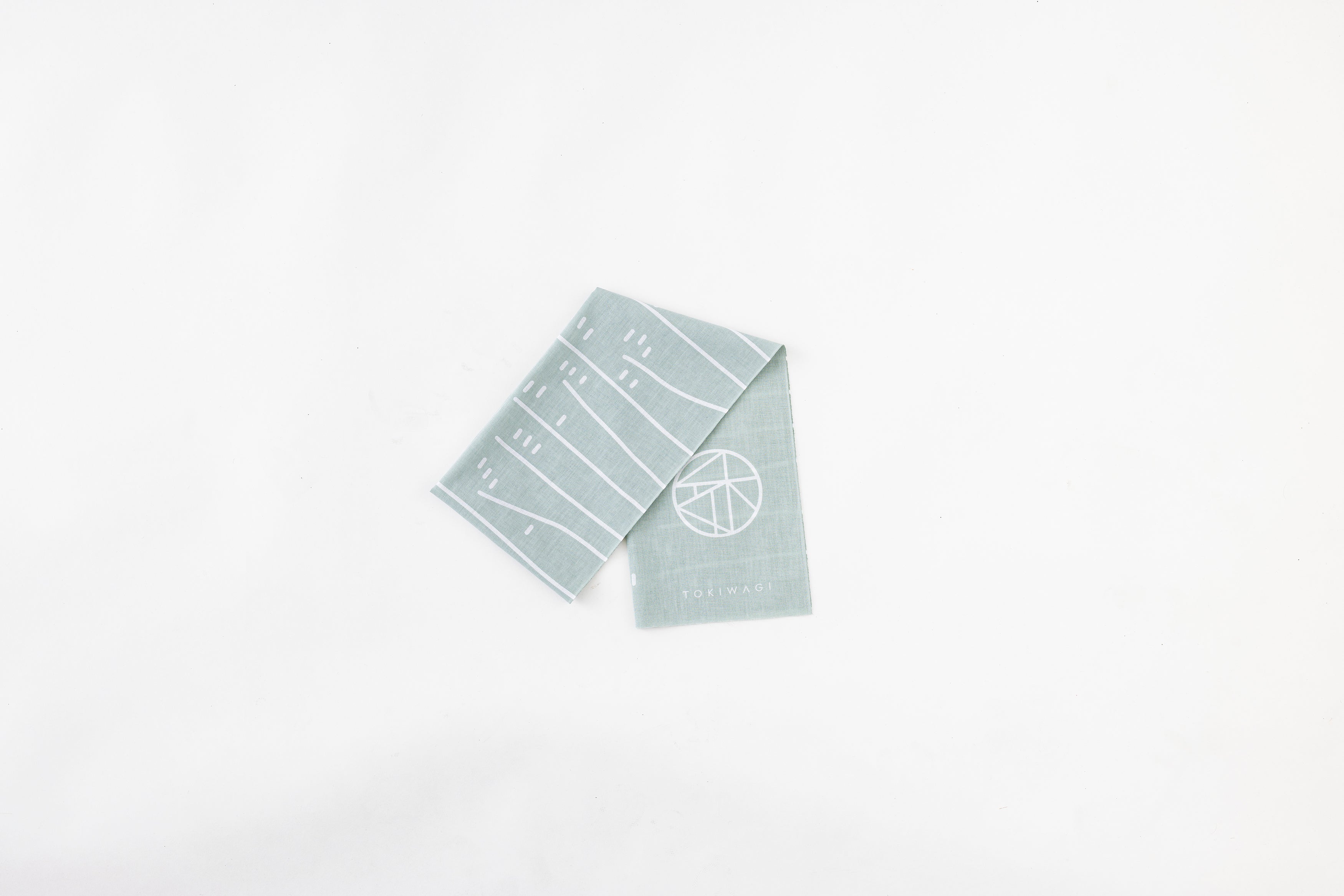 唐津を愛してやまないデザイナー・寺内ユミが「TOKIWAGIのインスピレーション、唐津の情景を映すもの」としてデザインした松葉色の手捺染てぬぐいです。松葉色は松を想起させ、やさしい風合いに仕上がりました。