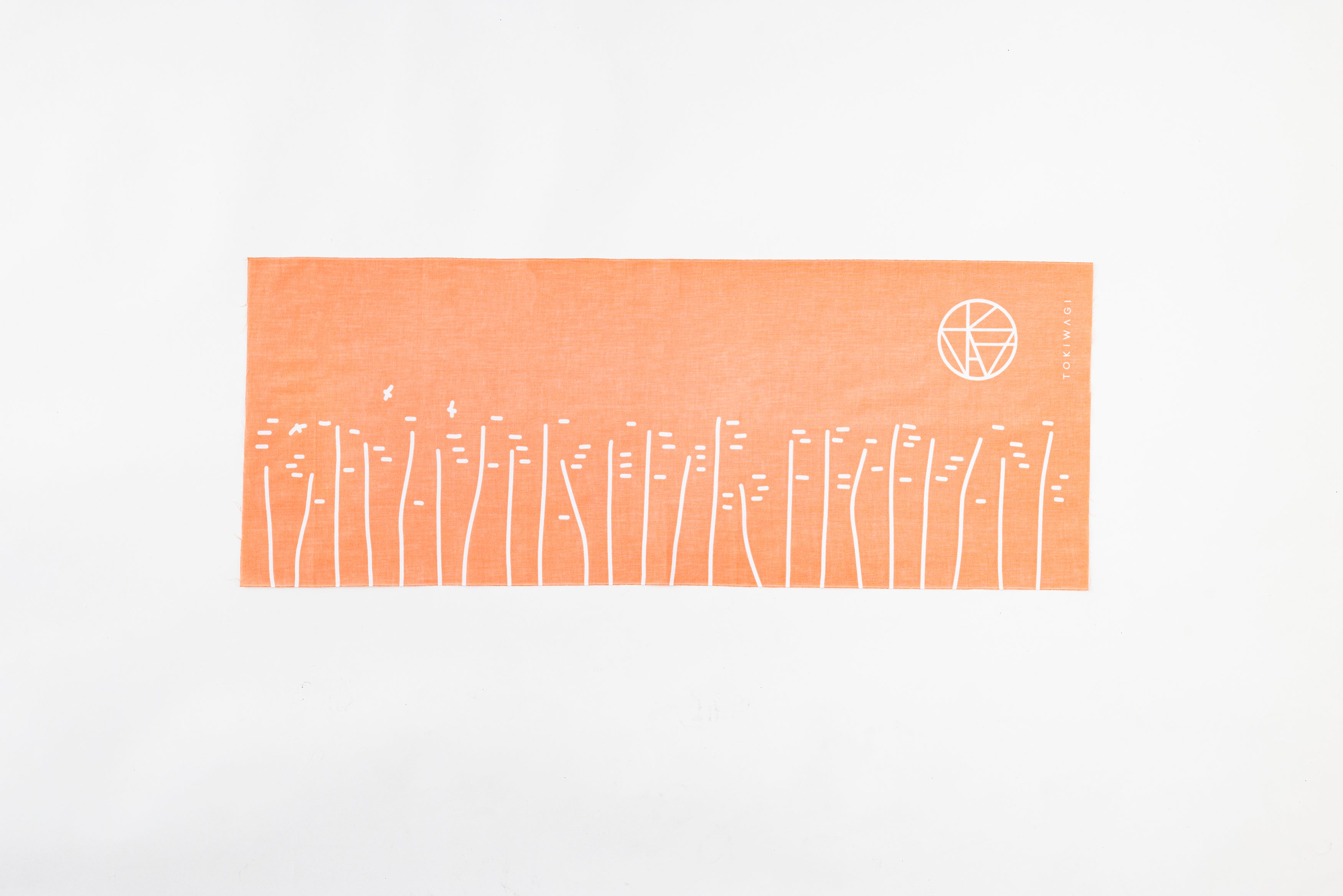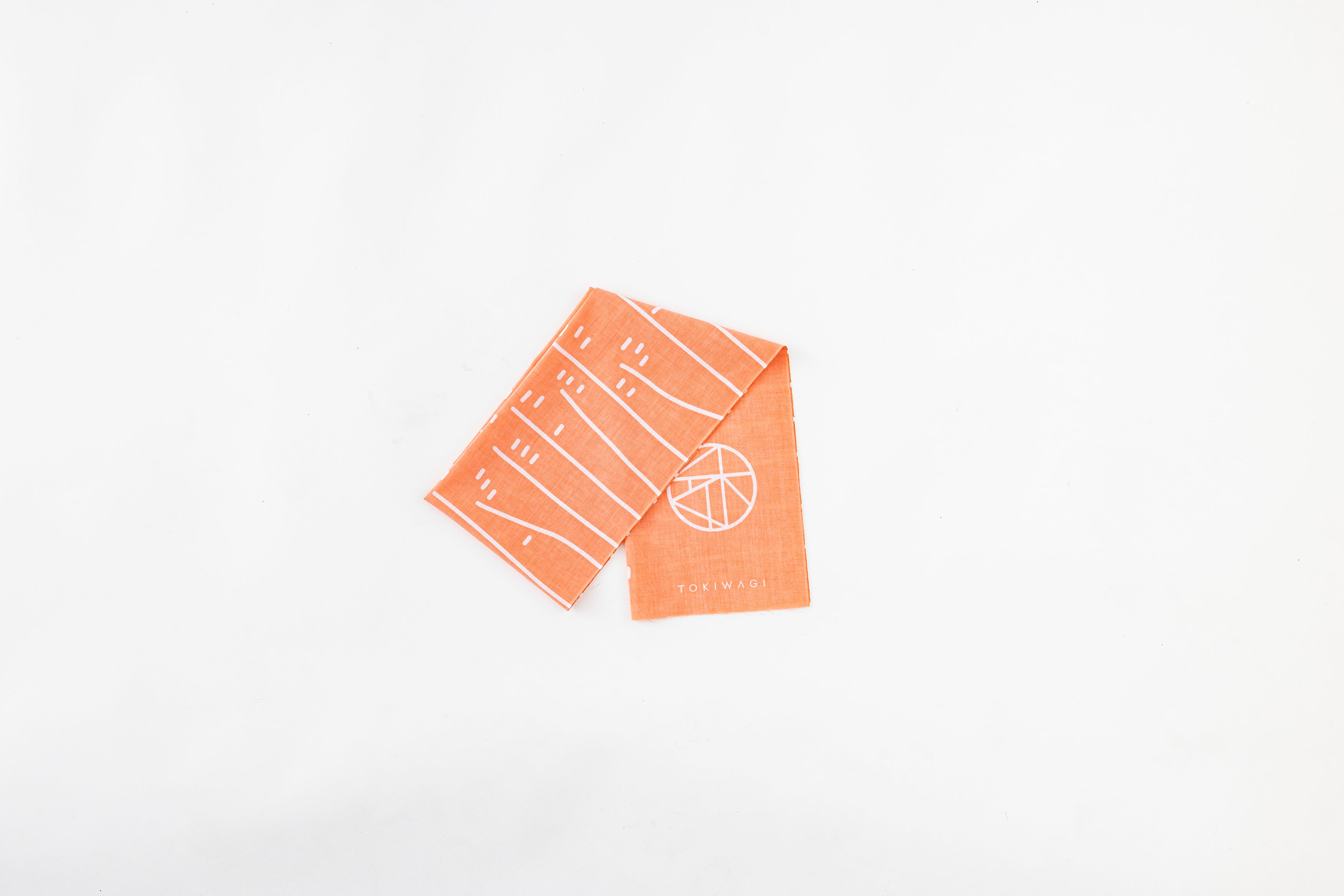 唐津を愛してやまないデザイナー・寺内ユミが「TOKIWAGIのインスピレーション、唐津の情景を映すもの」としてデザインした薄茜色の手捺染てぬぐいです。唐津の山に沈む美しい夕焼けの美しい色を思い出す選色です。